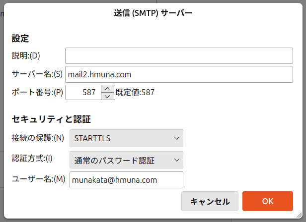 送信ポート(SMTP):587 ※SMTP over SSLの場合は、465