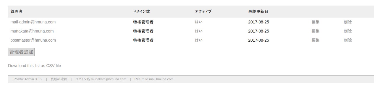 mysql> use mail; mysql> show tables; +-----------------------+ | Tables_in_mail | +-----------------------+ | admin | | alias | | alias_domain | | config | | domain | | domain_admins | | fetchmail | | log | | mailbox | | quota | | quota2 | | vacation | | vacation_notification | +-----------------------+ mysql> describe mailbox; +------------+--------------+------+-----+---------------------+-------+ | Field | Type | Null | Key | Default | Extra | +------------+--------------+------+-----+---------------------+-------+ | username | varchar(255) | NO | PRI | NULL | | | password | varchar(255) | NO | | NULL | | | name | varchar(255) | NO | | NULL | | | maildir | varchar(255) | NO | | NULL | | | quota | bigint(20) | NO | | 0 | | | local_part | varchar(255) | NO | | NULL | | | domain | varchar(255) | NO | MUL | NULL | | | created | datetime | NO | | 0000-00-00 00:00:00 | | | modified | datetime | NO | | 0000-00-00 00:00:00 | | | active | tinyint(1) | NO | | 1 | | +------------+--------------+------+-----+---------------------+-------+ mysql> select * from mailbox; +------------------------+------------------------------------+----------------+-------------------------+-------+--------------+-----------+---------------------+---------------------+--------+ | username | password | name | maildir | quota | local_part | domain | created | modified | active | +------------------------+------------------------------------+----------------+-------------------------+-------+--------------+-----------+---------------------+---------------------+--------+ | munakata@hmuna.com | $1$9975d93d$7uKDdKNnb6DAYdugiIWeN0 | hisao munakata | munakata@hmuna.com/ | 0 | munakata | hmuna.com | 2014-07-04 00:50:46 | 2014-07-04 00:50:46 | 1 | | mail-admin@hmuna.com | $1$773730f1$tE55MxG5mxTZPrYETPJcK0 | mail admin | mail-admin@hmuna.com/ | 0 | mail-admin | hmuna.com | 2014-07-04 00:50:04 | 2014-07-04 00:50:04 | 1 | | public_mail@hmuna.com | $1$045a718c$7weHeSb7EN0EtnV14e1xF. | hisao munakata | public_mail@hmuna.com/ | 0 | public_mail | hmuna.com | 2014-07-04 00:51:24 | 2014-07-04 00:51:24 | 1 | | server-admin@hmuna.com | $1$7f1c42b7$UzPUtxsgMAwwHpB3G40Ay0 | server admin | server-admin@hmuna.com/ | 0 | server-admin | hmuna.com | 2014-07-04 00:51:48 | 2014-07-04 00:51:48 | 1 | | yuko@hmuna.com | $1$4b287f90$7Zott.IlT053.SxHveM.M0 | yuko | yuko@hmuna.com/ | 0 | yuko | hmuna.com | 2014-07-04 00:52:50 | 2014-07-04 00:52:50 | 1 | | purple@hmuna.com | $1$2c52aa21$9a0F8dRCzBWrebrJriY5r/ | yuko | purple@hmuna.com/ | 0 | purple | hmuna.com | 2014-07-04 00:53:17 | 2014-07-04 00:53:17 | 1 | +------------------------+------------------------------------+----------------+-------------------------+-------+--------------+-----------+---------------------+---------------------+--------+
