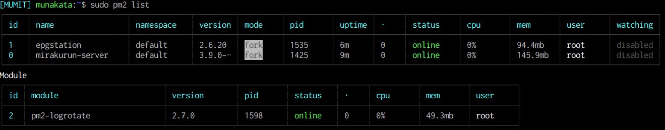 [MUMIT] munakata:~/plex$ sudo pm2 start mirakurun-server