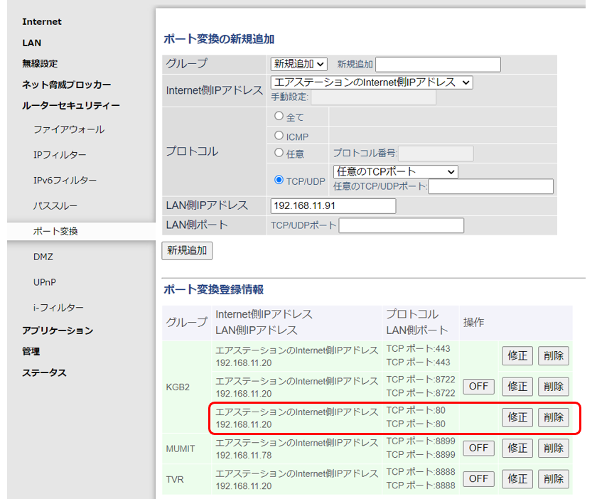 Buffalo ルーターの 80番ポート転送を追加†