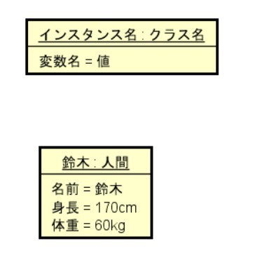 オブジェクト図はインスタンス名、クラス名、変数名、値で構成される