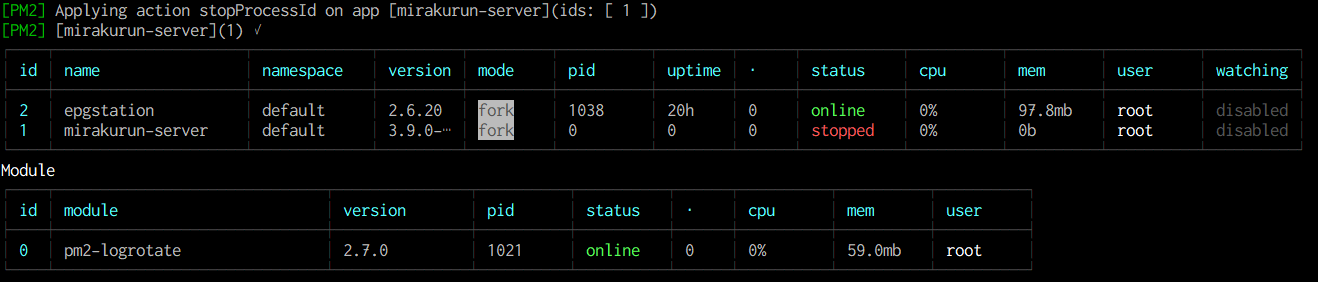 [MUMIT] munakata:~/git/EPGStation$ sudo pm2 stop epgatation