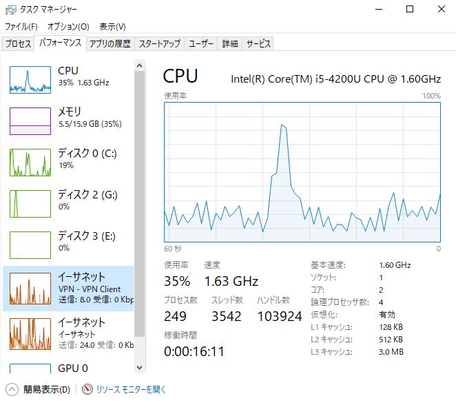 - 有効になっているかの確認:スタート右クリック → [タスクマネージャー] → [パフォーマンス] → [仮想化]