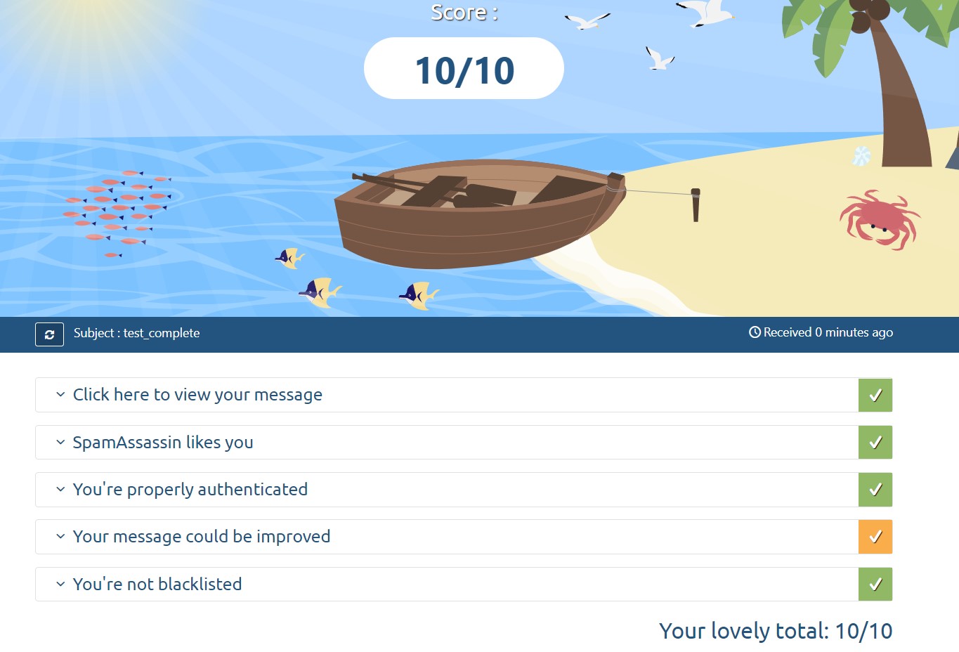 - 上記変更後に メールテスター で確認したところ 10/10 に復帰した。
