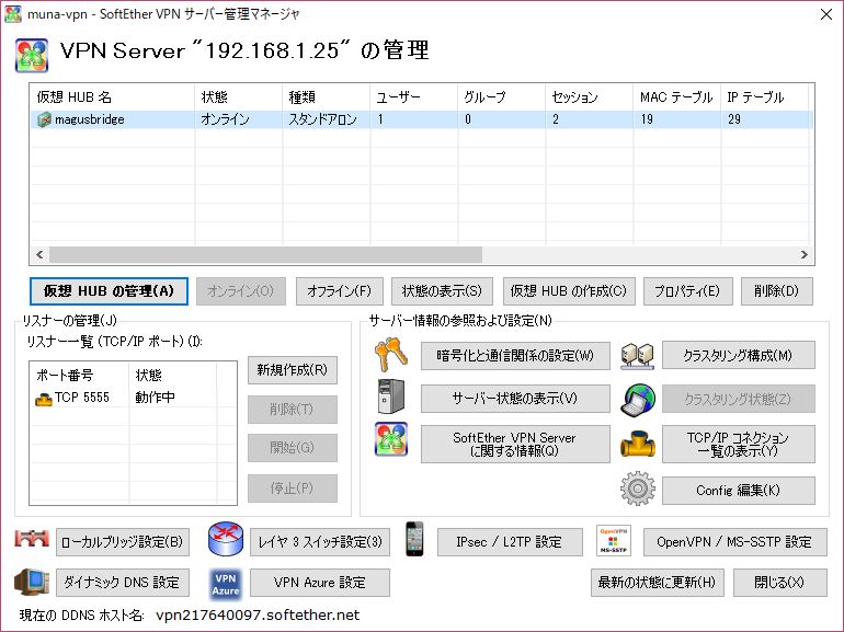 VPN Client>AccountList AccountList コマンド - 接続設定一覧の取得 項目 |値 -------------------+-------------------------------------- 接続設定名 |e450_to_1203 状態 |オフライン 接続先 VPN サーバー|119.245.194.30:5555 (直接 TCP/IP 接続) 仮想 HUB 名 |magusbridge 仮想 LAN カード名 |vpn1 コマンドは正常に終了しました。